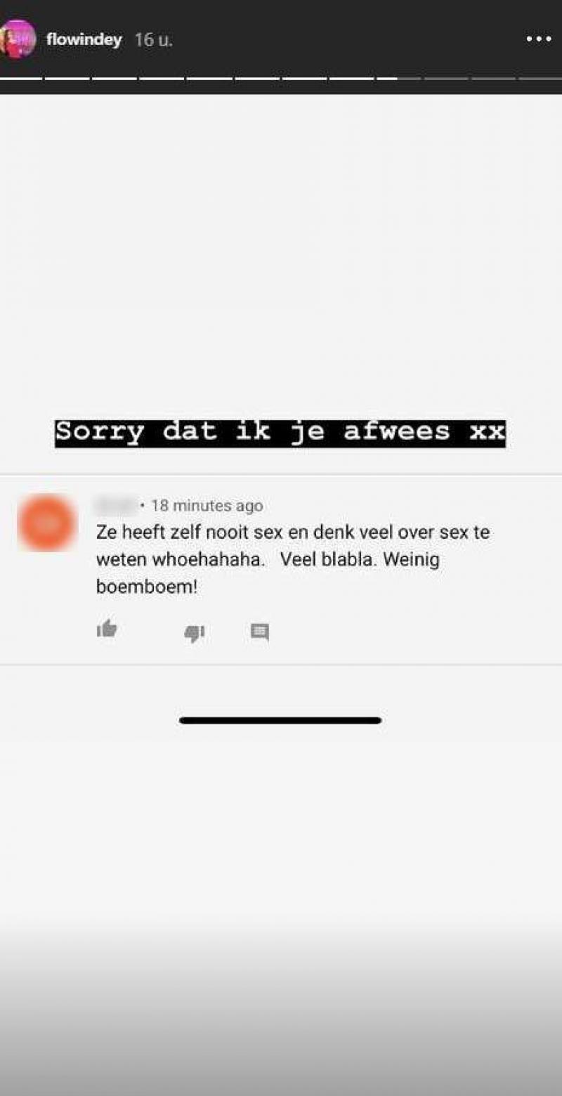 Een kijker reageerde nogal flauwtjes op een van haar video's, maar dat was dan zonder haar assertieve zelve gerekend. Ze heeft zelf nooit seks en denkt veel over seks te weten. Veel blabla, weinig boemboem, sneerde hij. Waarop Flo gortdroog, maar heerlijk raak antwoordde: Sorry dat ik je afwees, aangevuld met twee sarcastische x'jes. Los in de winkelhaak, als je het ons vraagt.