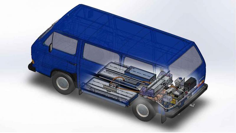 De Fransman heeft zijn iconische busje omgevormd tot een elektrisch zonnepaneel op wielen. In de wagen zit een 100 pk-motor van een elektrische Ford Transit en een halve accu uit een Tesla. De zonnepanelen op het dak van de wagen zouden de motor in slechts 8 uur tijd kunnen opladen.