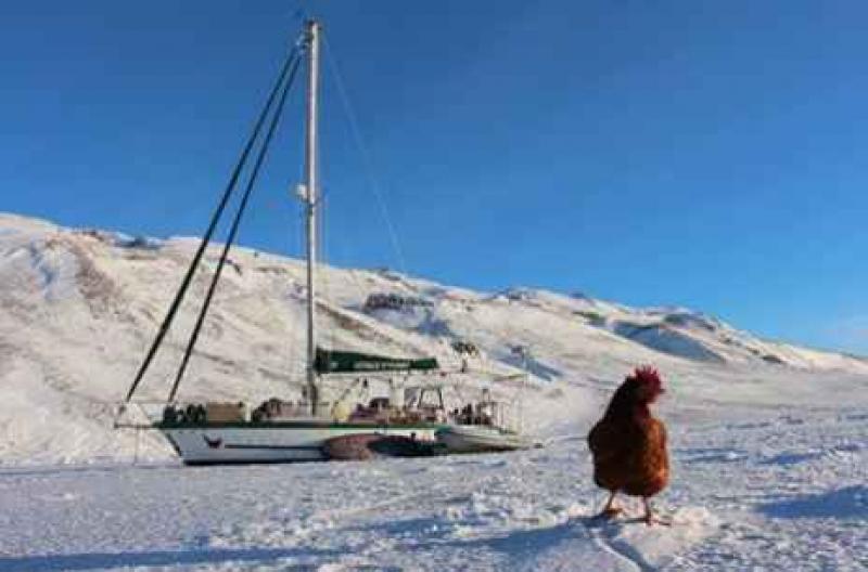 De beestige reisgenoot kreeg de naam Monique en vergezelt Guirec al twee jaar op reis. Hij ontmoette de kip op de Canarische Eilanden en hoewel hij haar al eens even beu gezien kan zijn, vertelt hij blij te zijn met de grote hoeveelheid eieren die hij aan boord heeft.