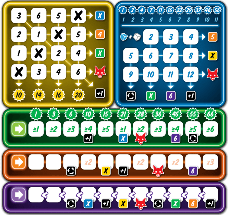 Je scoort niet enkel op het einde van het spel punten. Zodra je sommige velden aangeduid hebt, activeer je een bonus om bijvoorbeeld een blauw veld naar keuze te schrappen of een 6' in te vullen bij de paarse categorie. Als je dit een beetje slim aanpakt, kan er een ware kettingreactie aan bonussen ontstaan.