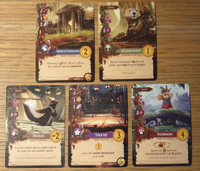 Aangezien je met slechts 2 werkers start moet je onmiddellijk tactische keuzes maken. Daarbij spelen de kaarten in jouw hand en die in de centrale weide dan ook een cruciale rol. Op iedere kaart wordt vermeld welke grondstoffen je moet betalen, welke effecten ze hebben en hoe frequent de kaart in het spel voorkomt. Zo zorgt het gerechtsgebouw ervoor dat je bij de constructie van ieder volgend gebouw een grondstof naar keuze op hand mag nemen.