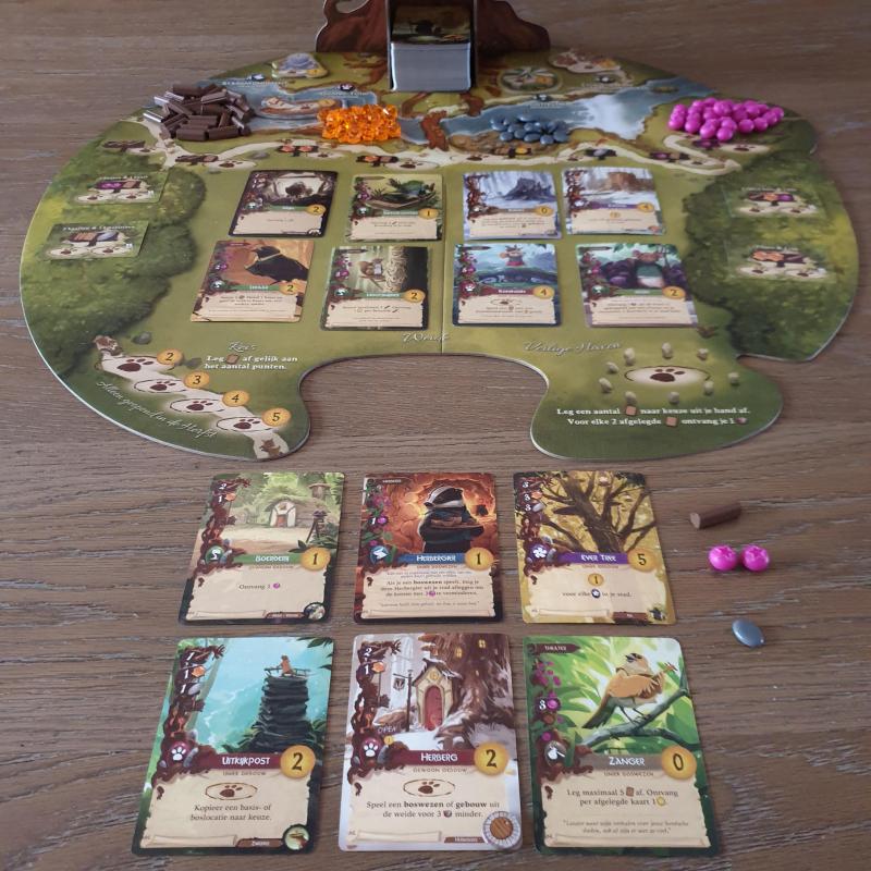 Zoals bij ieder goed spel komt er ook bij Everdell wat voorbereiding aan te pas. Plaats alle grondstoffen (bessen, takken, stenen en hars) op het bord en trek willekeurige kaarten voor de bosvelden. De boskaarten vertonen afhankelijk van het aantal spelers 1 of 2 extra actievelden waar spelers hun werkers op kunnen plaatsen. Op het laagste niveau van de Ever Tree worden 4 gebeurteniskaarten gespeeld en in de hoogste takken van de kruin plaatst iedereen 4 meeple. De resterende 2 meeple krijg je ter beschikking voor de start van het spel.