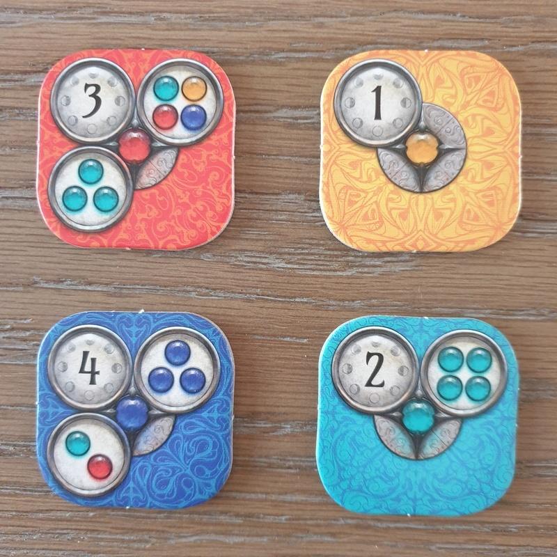 Het doel is om jouw resterende 20 schijven zo snel mogelijk weg te spelen door opdrachten uit te voeren. Kies 1 van de 3 volgende gekleurde tegels (in wijzerzin) t.o.v. de maantoken. Iedere tegel bevat 3 elementen: een kleur, een tijdskost en een aantal opdrachten. Hoe eenvoudiger de opdrachten, hoe hoger de kost van de tegel.