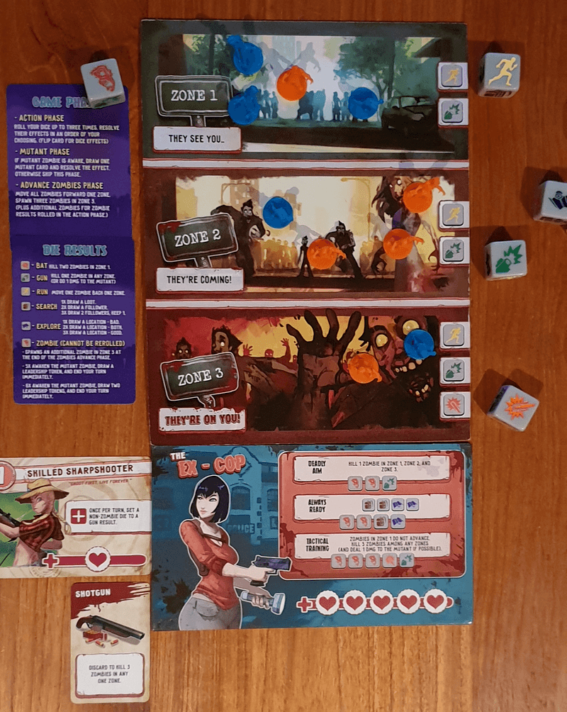 Bij de start van je beurt rol je alle dobbelstenen. Afhankelijk daarvan kan je zombies de kop inslaan, locaties verkennen of naar overlevenden zoeken.