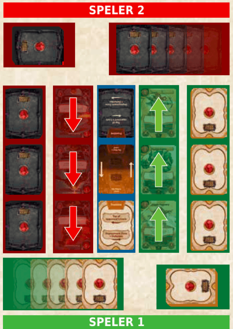 Het slagveld bestaat opgedeeld in 2 helften. Uiterst rechts ligt jouw deck in 3 gelijke stapels. Dit zijn eveneens jouw levenspunten! Als je geen kaarten meer hebt is het game over.