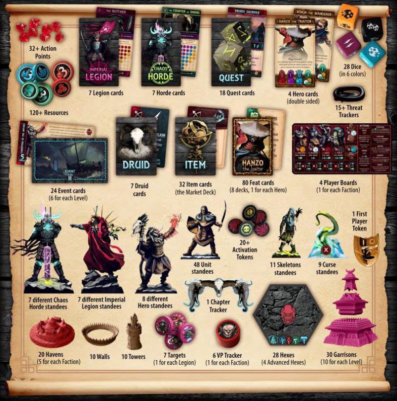 De inhoud van de doos is net zo rijkelijk als de verhaallijn van het spel. Met meer dan 150 tokens, 179 spelkaarten, een spelbord, 4 spelersborden, 90 standees, 28 dobbelstenen, 70 miniaturen en 28 speltegels zal je niets te kort komen.