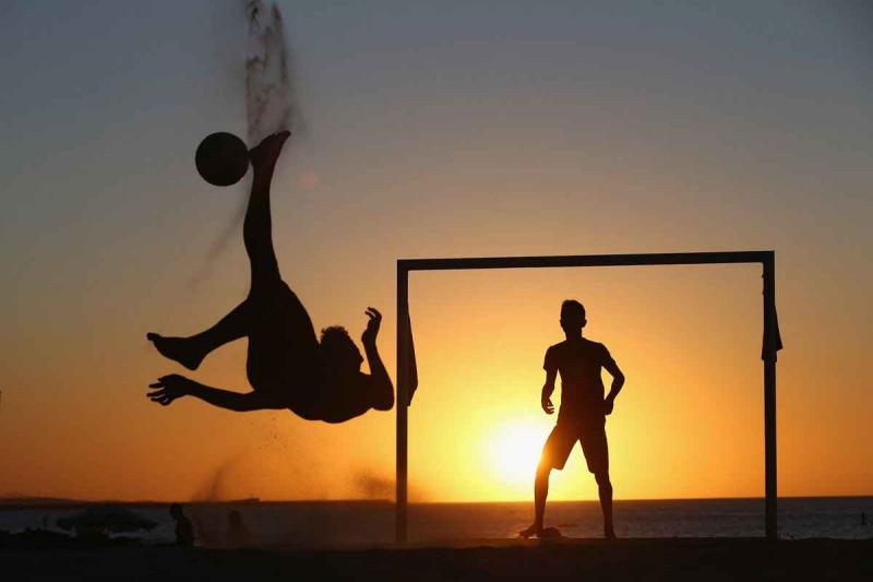 Braziliaanse kinderen trappen een balletje op het strand terwijl de zon langzaam ondergaat.