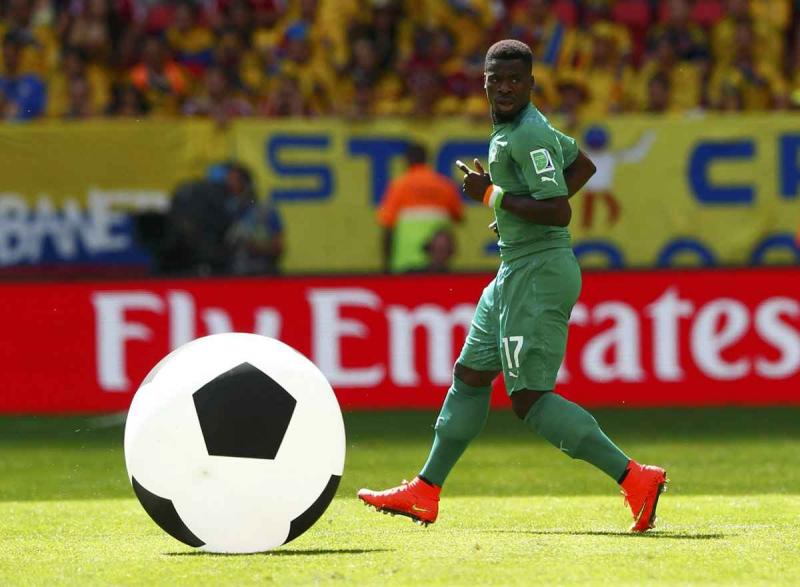 Aurier ruimt een reusachtige strandbal op die een enthousiaste fan op het veld had gegooid.