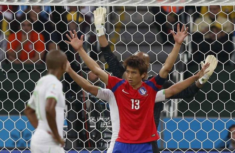 Algerije verdedigt een hoekschop van Zuid-Korea.