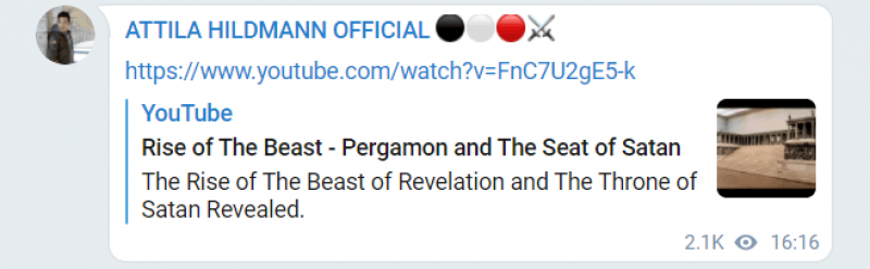 Hildmann beweert dat het Pergamon Museum het centrum is van het wereldwijde satanisme omdat het het oud-Griekse Pergamonaltaar herbergt. In augustus en september postte Hildmann nog berichten op de sociale media-app Telegram waarin hij suggereerde dat Duits bondskanselier Angela Merkel het altaar gebruikte voor "menselijke offers".