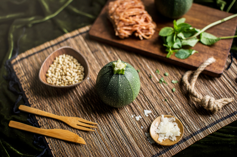 Snij de hoedjes van de courgettes, leg ze apart en lepel het vruchtvlees eruit met een lepel.