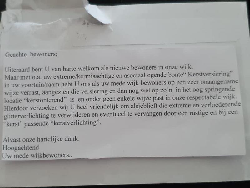 De buren van een Nederlands gezin vonden diens kerstverlichting storend en verzochten hen via een brief om daar iets aan te doen. Geachte bewoners, uiteraard bent U van harte welkom als nieuwe bewoners in onze wijk. Maar met onder andere uw extreme/kermisachtige en asociaal ogende bonte kerstversiering' in uw voortuin/raam heeft U ons als uw medewijkbewoners op een zeer onaangename wijze verrast. Uw versiering, die bovendien op zo'n in het oog springend locatie kerstonterend' is, past op geen enkele wijze in onze respectabele wijk. Hierdoor verzoeken wij U heel vriendelijk om alsjeblieft die extreme en verloederende glitterverlichting te verwijderen en eventueel te vervangen door een rustige en bij een kerst' passende kerstverlichting', klinkt het.