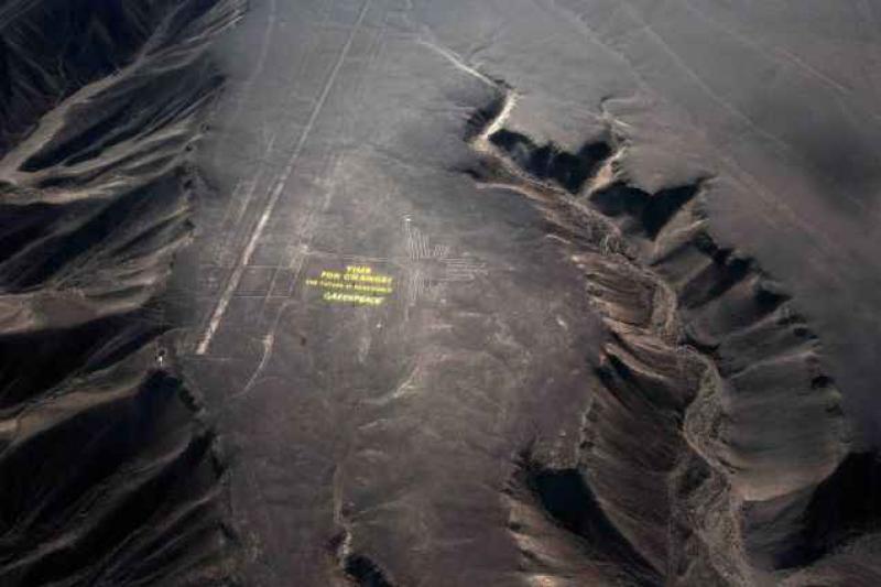 Verschillende Greenpeace-activisten hebben naast de figuur van een kolibrie een enorm geel doek gelegd waarop te lezen staat dat het tijd is voor verandering en de toekomst hernieuwbaar is. Ze lieten ook hun handtekening achter. Het bericht was bedoeld voor afgevaardigden van 190 landen bij de VN-klimaattop in Lima.