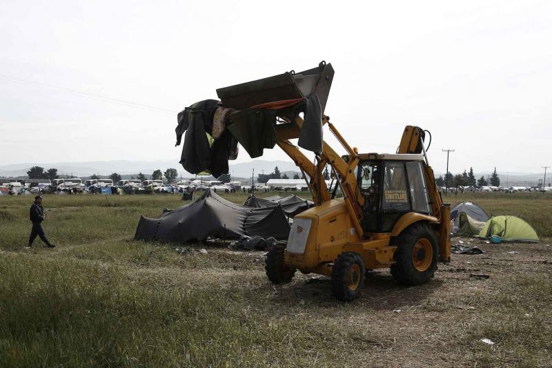 Minstens 200 politieagenten, agenten in burger en twintig politievoertuigen werden opgetrommeld. Volgens persagentschap AFP gebeurde de ontruiming zonder het gebruik van geweld. Er werden graafmachines ingezet om de tenten af te breken (foto). De politie, bijgestaan door een helikopter die over het kamp vloog, spoorde de vluchtelingen aan om op een bus te stappen die hen naar naburige opvangcentra moest brengen. Giorgos Kurytsis, de woordvoerder van het nationale vluchtelingencrisiscomité, zei eerder al dat de actie enkele dagen zal duren. In Griekenland zijn nog steeds tienduizenden vluchtelingen gestrand, velen van hen op de Griekse eilanden. Zij wachten op het resultaat van hun asielprocedure, een proces dat lang kan aanslepen.