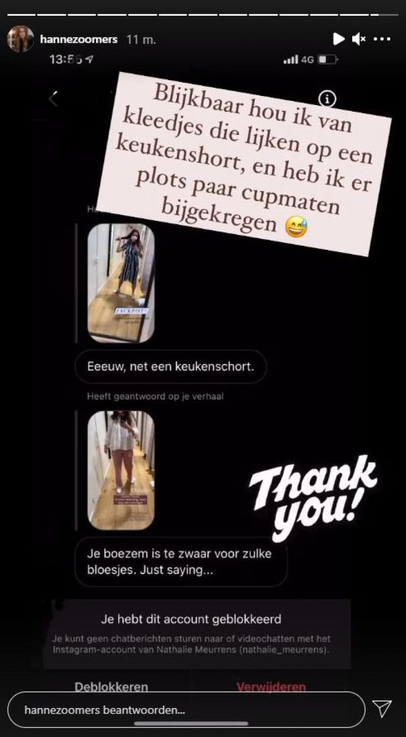 Beetje ongepast en dat vond Hanne er ook van. "Blijkbaar hou ik van kleedjes die lijken op een keukenschort, en heb ik er plots een paar cupmaten bijgekregen", knipoogde ze erbij. Vervolgens blokkeerde ze de volger. In een laatste Stories bewijst ze dat ze wél goed staat met het bewuste bloesje.