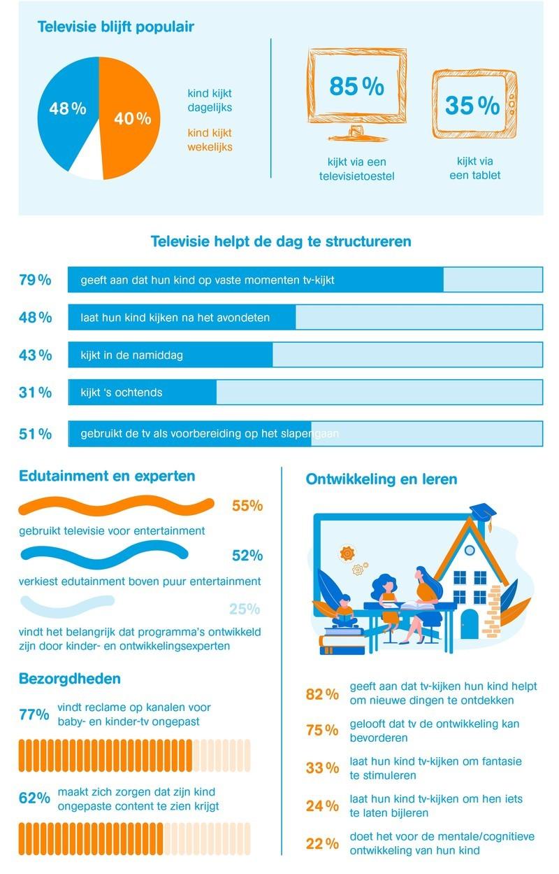 Zullen we met z'n allen meer tv kijken nu het weer grauwer wordt en we wat meer thuis moeten blijven? Een ding is zeker, de helft van de kinderen tussen 0 en 6 jaar kijkt nu al dagelijks tv. En nog eens 4 op de 10 ouders geeft aan dat dat minstens wekelijks gebeurt. Voor de grote meerderheid zit hier een routine in en kan het dus helpen de dag te structureren. Zo gebruikt de helft van de ouders de tv als voorbereiding op het slapengaan. Verder zijn na het avondeten, in de namiddag en in de ochtend de meest populaire momenten. Het is dan ook niet verwonderlijk dat 8 op 10 aangeeft dat ze op ieder moment toegang willen hebben tot kwaliteitsvolle baby- en kinder-tv.