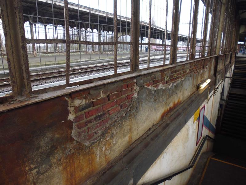 De veiligheid van de treinreizigers is in het station nauwelijks nog gegarandeerd. Daarom droegen de bezoekers veiligheidshelmen tijdens de rondleiding.