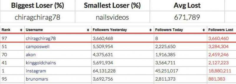 Justin Bieber en 50 Cent kregen een kleine slag, maar het valt te betwijfelen of de twee immens populaire artiesten volgelingen op Instagram gekocht hebben. chiragchirag78 deed dat 100% zeker wel. Hij had voor The Purge 3,6 miljoen volgelingen en zag dat aantal verminderen tot 8. Ja, acht volgelingen. Dat betekent dat meneer chiragchirag78 zijn volgelingen met 99,9% zag dalen en dat hij meer volgelingen kocht dan dat er mensen in Puerto Rico wonen.