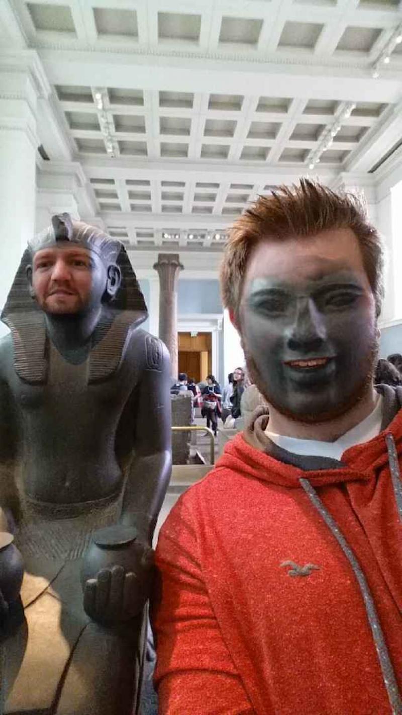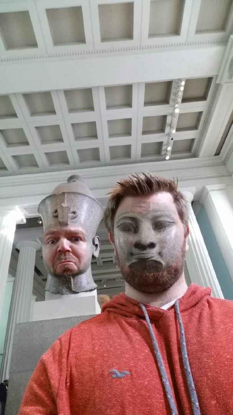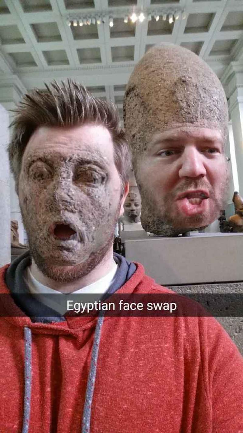 Jake Marshall bezocht het British museum onlangs en maakte er perfect gebruik van de faceswapping-functie van zijn smartphone. Zo plaatste hij zijn gezicht op allerlei standbeelden, terwijl het gelaat van de standbeelden op zijn schouders verscheen. Het resulteerde in een hilarische fotoreeks, die Marshall op Imgur plaatste.