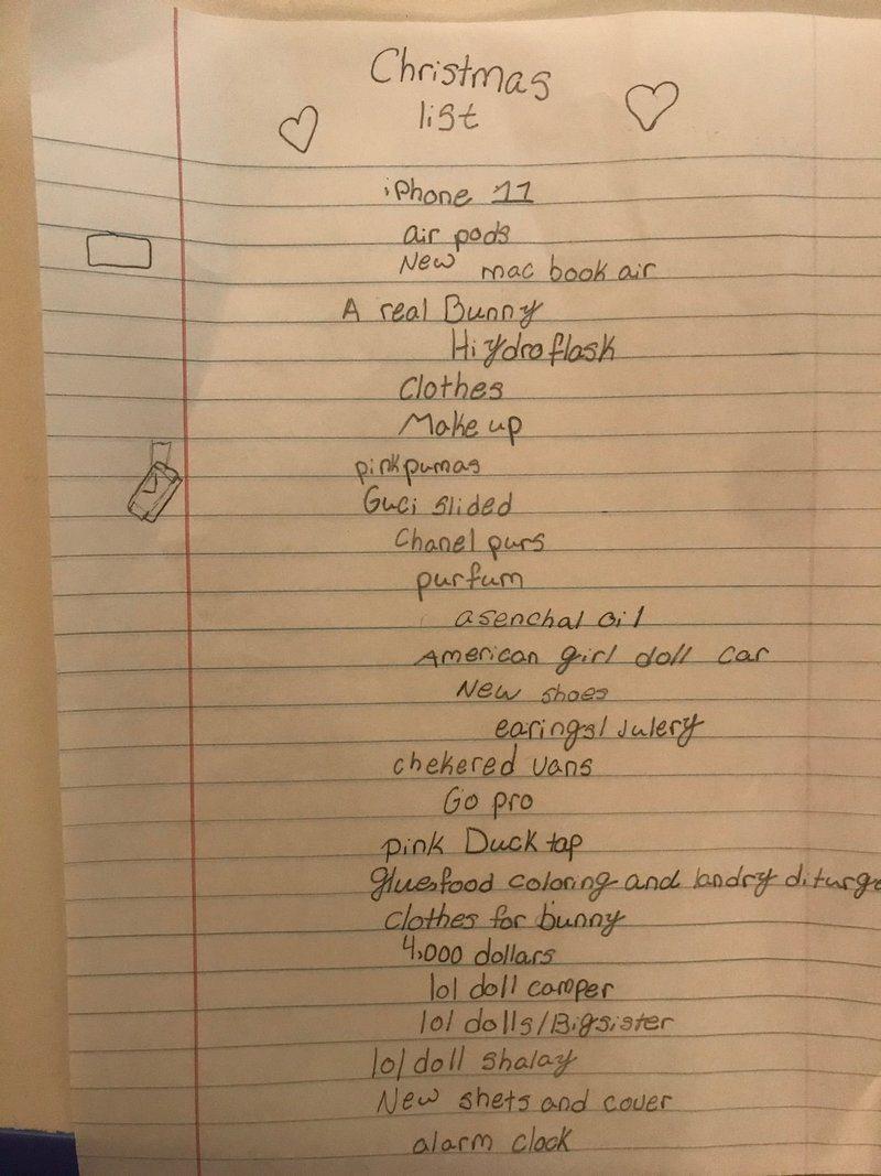 Een man uit Los Angeles kreeg onlangs het Kerstmis-verlanglijstje van zijn dochter, die bijna tien jaar oud is. Vol verbazing las hij de 26 netjes neergepende items. Van een iPhone 11 over een handtas van Chanel tot zelfs een geldbedrag van 4.000 dollar.