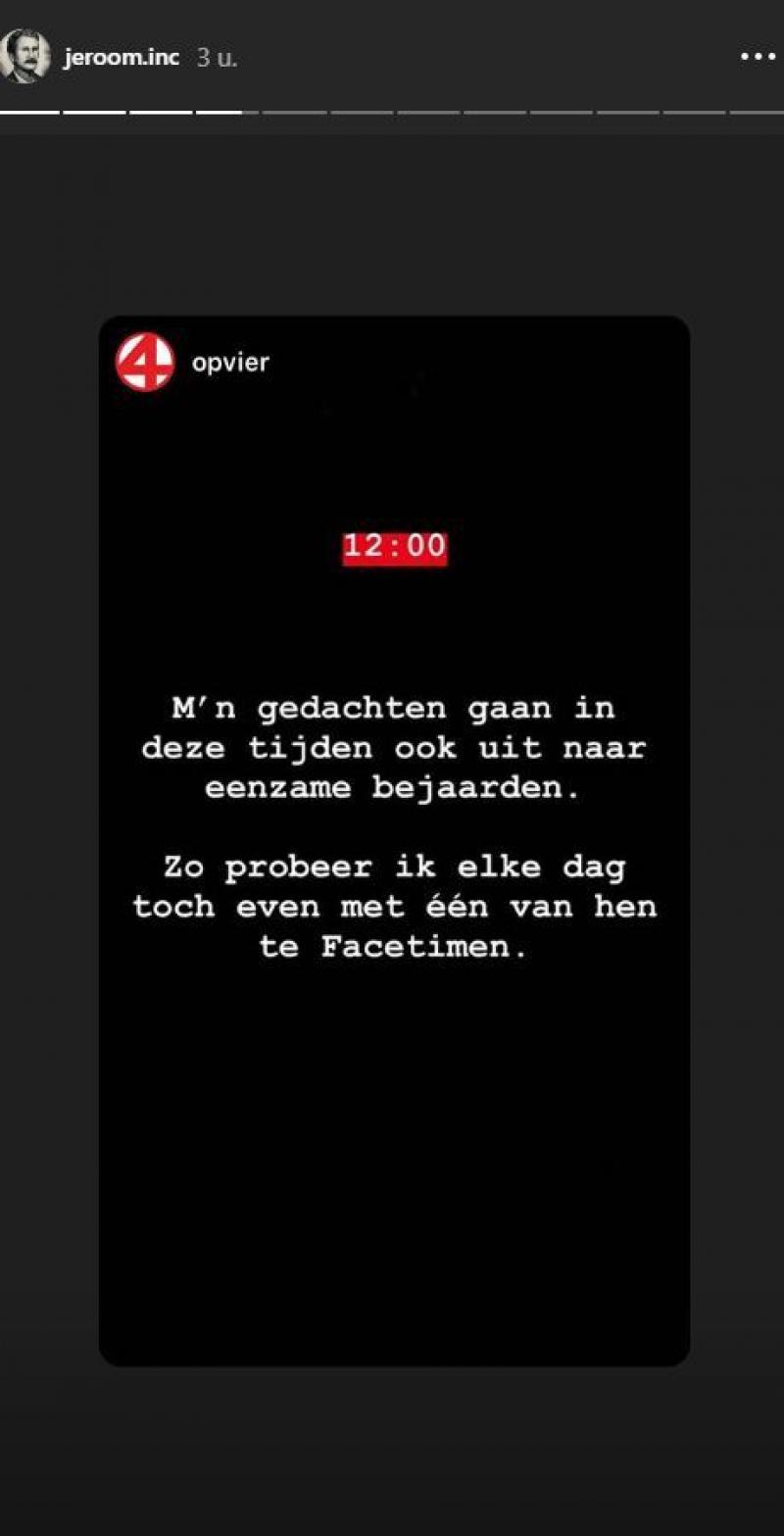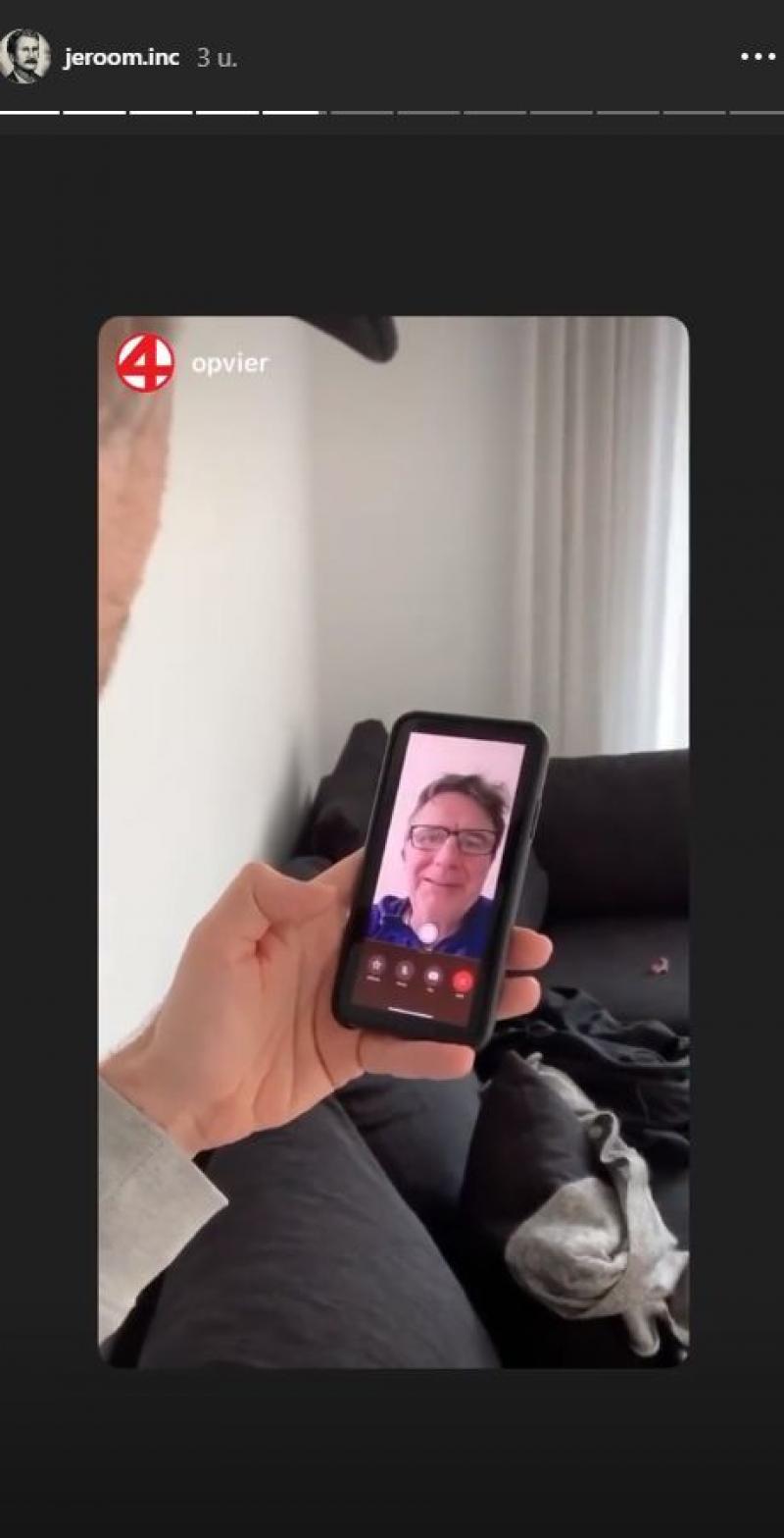 Maar ook nu moet Erik eraan geloven. Jeroom deelde op Instagram een ludiek overzicht van zijn dagen in isolement. Mijn gedachten gaan in deze tijden ook uit naar eenzame bejaarden. Zo probeer ik elke dag even met één van hen te facetimen, schreef hij, om vervolgens niemand minder dan Erik Van Looy te facetimen...