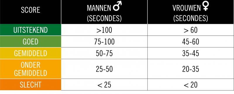 Probeer een tempo van ongeveer 95 stappen per minuut aan te houden gedurende drie minuten. Stop na drie minuten en lees onmiddellijk je hartslag af van je hartslagmeter of tel je hartslag zelf (gebruik je pols, nek of borst) gedurende twintig seconden. Vermenigvuldig dat met drie en je hebt je score.