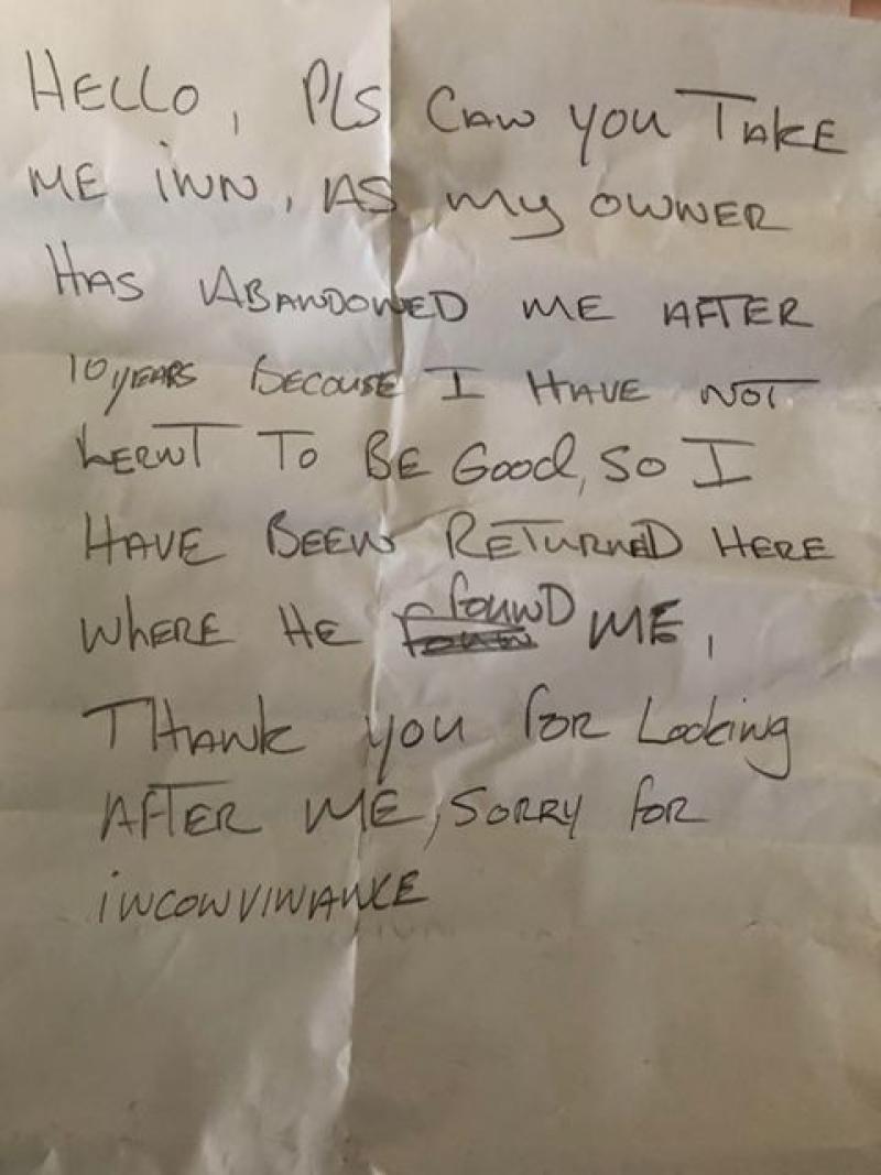Maandagmorgen werd een zwarte labrador aangetroffen aan een poort in Kent (Engeland). De eigenaar had hem daar achtergelaten na tien jaar voor hem gezorgd te hebben. Bij de hond zat een boodschap van het baasje. Kan je me alstublieft adopteren aangezien mijn baasje me na tien jaar verlaten heeft omdat ik niet leerde om braaf te zijn. Hij heeft me afgezet op de plek waar hij me tien jaar geleden vond, klonk het.