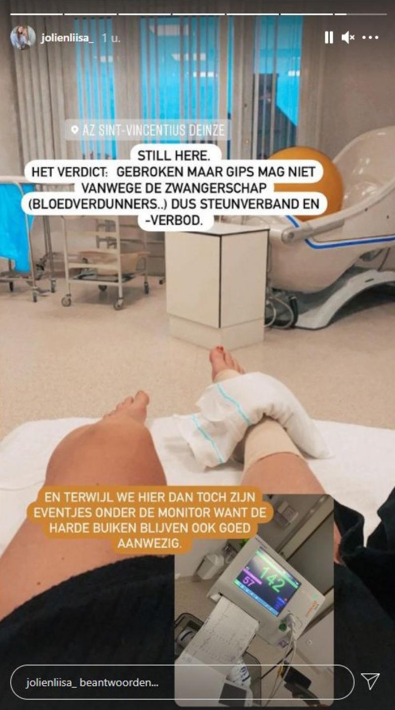 De 27-jarige blondine, die in 2017 met Herbert meedeed aan Temptation Island', zakte door haar slapende voet en moest naar het ziekenhuis. Het is mijn week precies niet. Te rap rechtgestaan terwijl mijn voet sliep en krak'. Ja, het is pijnlijk. Het verdict: gebroken, maar gips mag niet vanwege de zwangerschap (bloedverdunners), dus steunverband en -verbod, schrijft ze op Instagram.