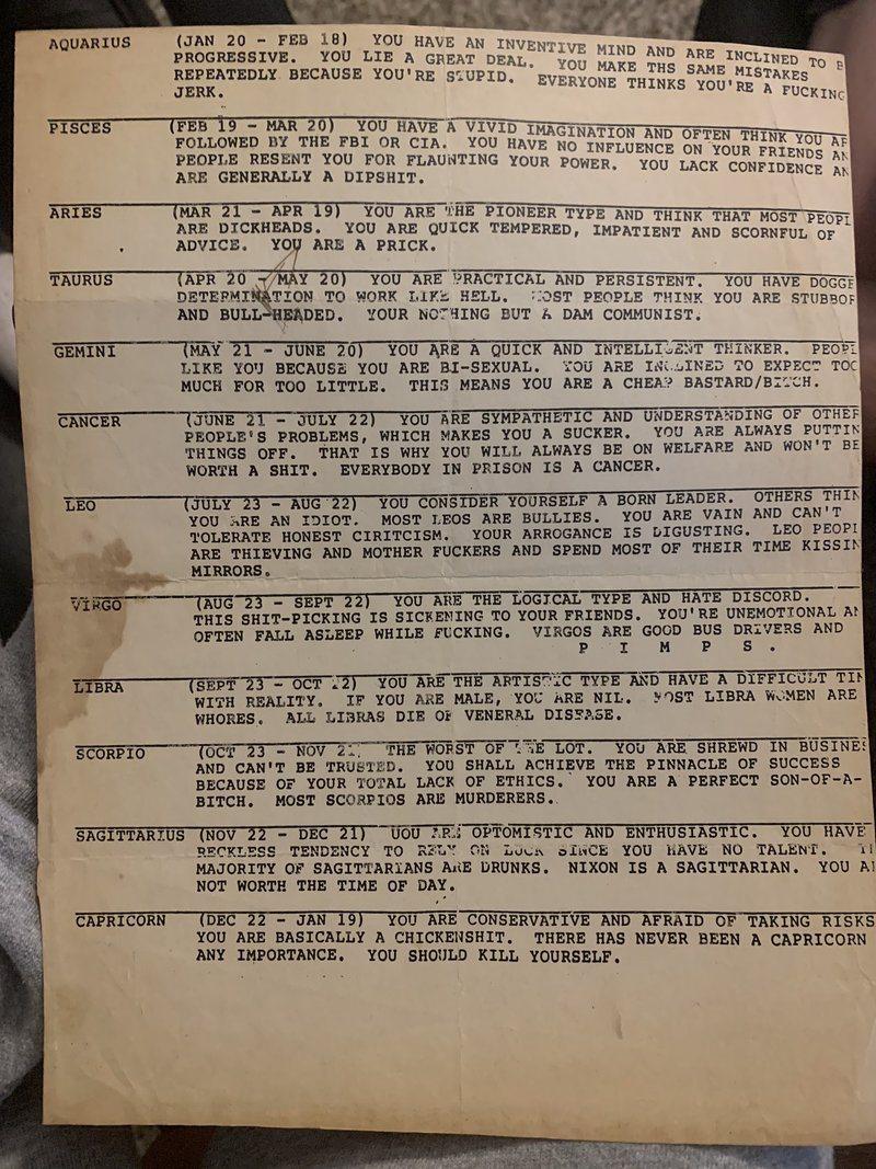 WATERMAN (20 januari tot 18 februari): "Je hebt een inventieve geest en bent geneigd om vooruitstrevend te zijn. Je liegt heel vaak. Je maakt voortdurend dezelfde fouten omdat je dom bent. Iedereen vindt je een verdomde eikel."