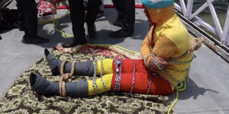 Mandrake werd volledig vastgebonden met touwen en kettingen en voer met een boot naar het breedste punt van de Hugli-rivier. Die is ter hoogte van de Golf van Bengalen maar liefst 32 kilometer breed. Daar liet een kraan hem zakken, zodat hij kon ontsnappen en naar de oever kon zwemmen.