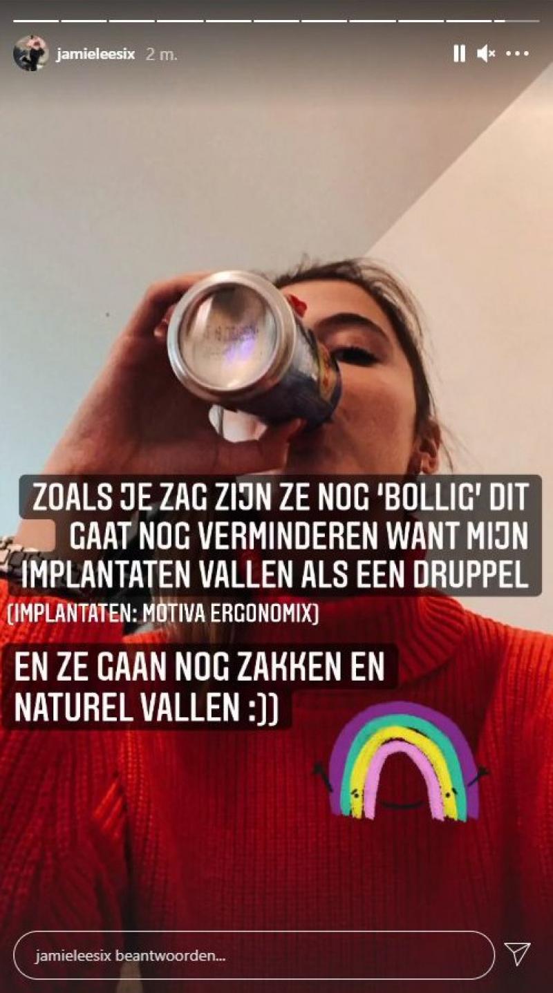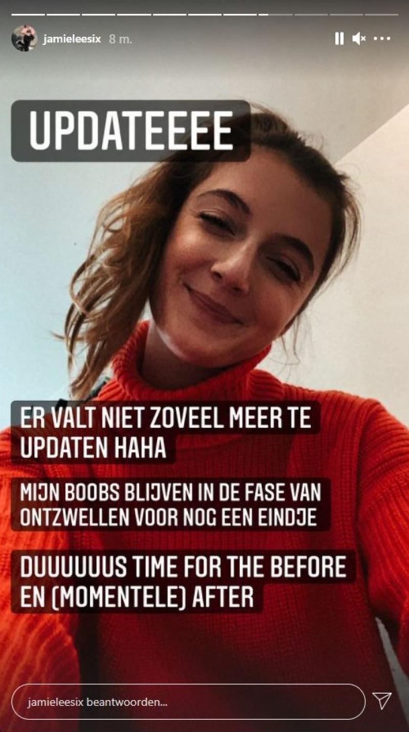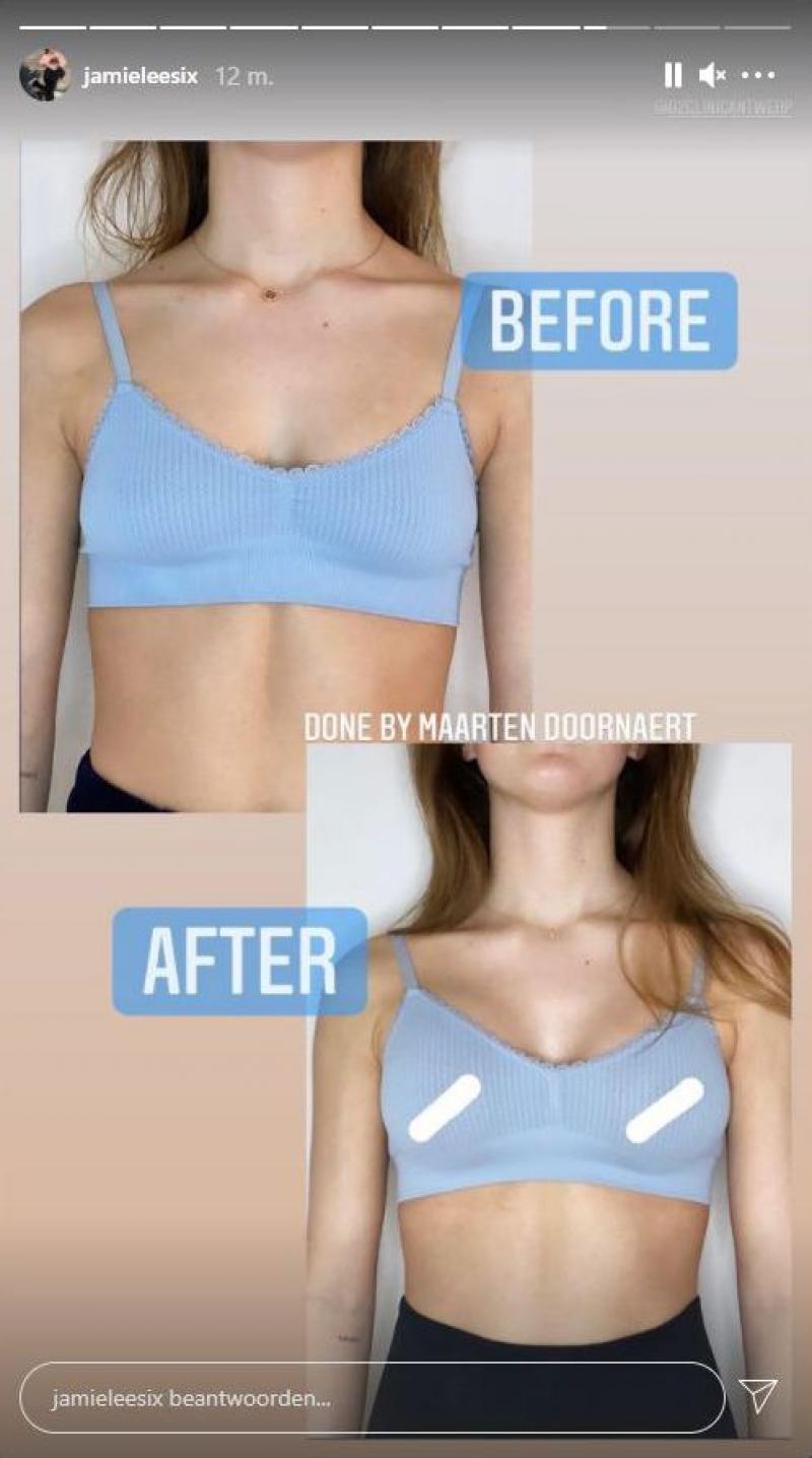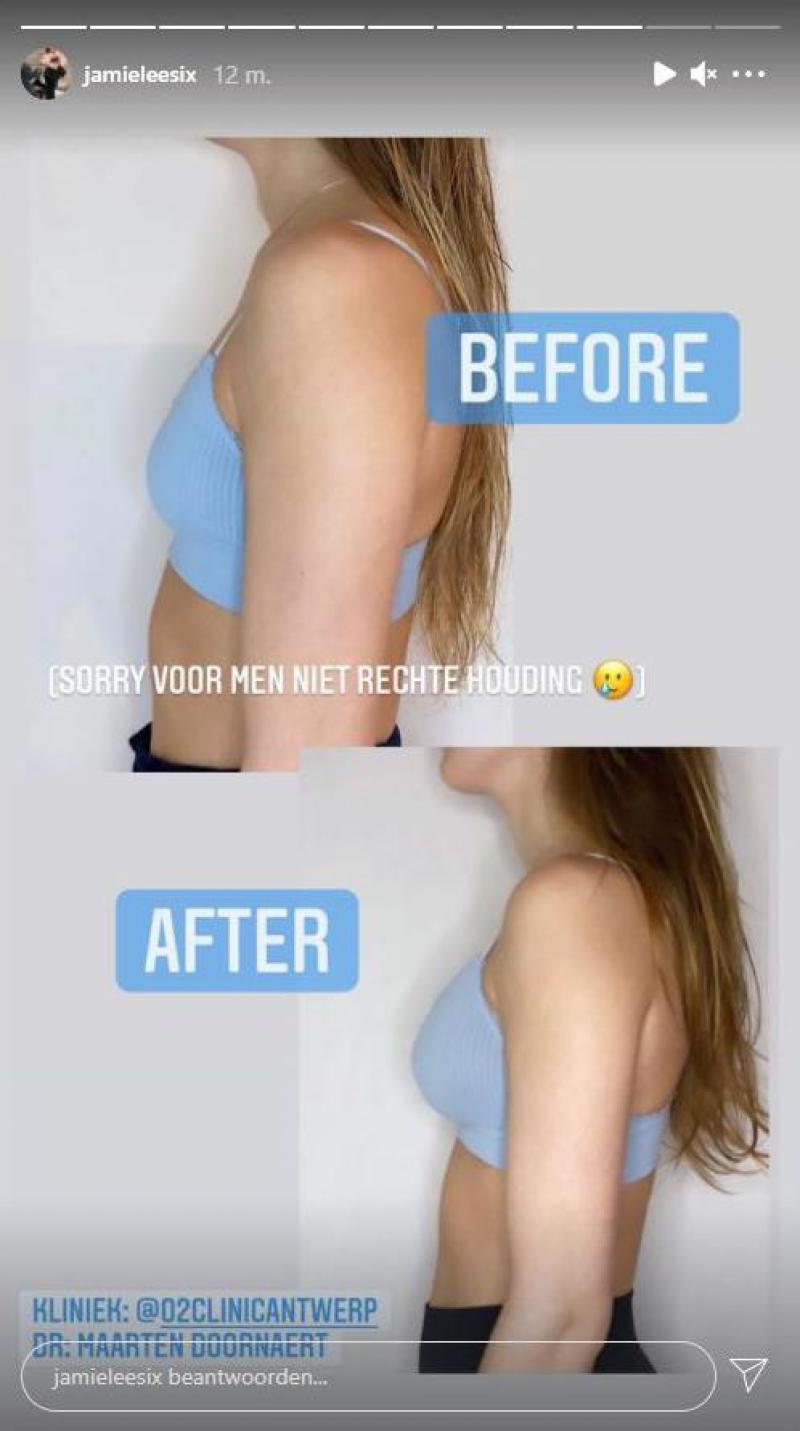 Drie weken geleden onderging TAGMAG-reporter Jamie-Lee Six (22) een borstvergroting. Dat wilde ze al een tijdje omdat ze zich onzeker voelde. "Ik doe dit enkel en alleen voor mezelf. Ik voelde me niet zelfzeker. Het is niet zo dat ik kleine borsten niet mooi vind. Mijn kleine borstjes waren mooi, maar ik wou me vooral iets vrouwelijker voelen met een maatje meer. En ja, ik had complexen. Ik wilde me beter in m'n vel voelen. Korte topjes durfde ik nooit te dragen omdat ik me dan te kinds voelde. En een kleedje met een open rug evenmin. 't Zijn kleine dingen, hé. Ook sommige bikini's pasten niet zo mooi bij m'n kleine boezem. Ik voelde me er niet echt goed bij", vertelde ze vorige week in TV Familie.