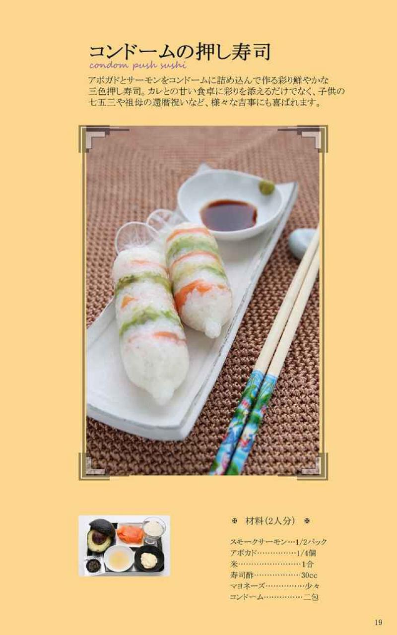 Het nieuwe condoom-kookboek werd deze week gelanceerd in Japan en heeft de titel tsukutte agetai condomu gohan, wat ruwweg vertaald kan worden als "Ik wil een condoom om voor u te koken." Natuurlijk wordt het voorbehoedsmiddel niet als ingrediënt maar als keukengereedschap gebruikt. De auteurs hebben 11 verschillende recepten ontwikkeld die de duurzaamheid en flexibiliteit van het condoom in de spotlight zetten.