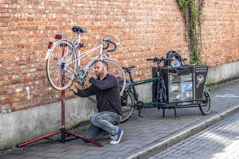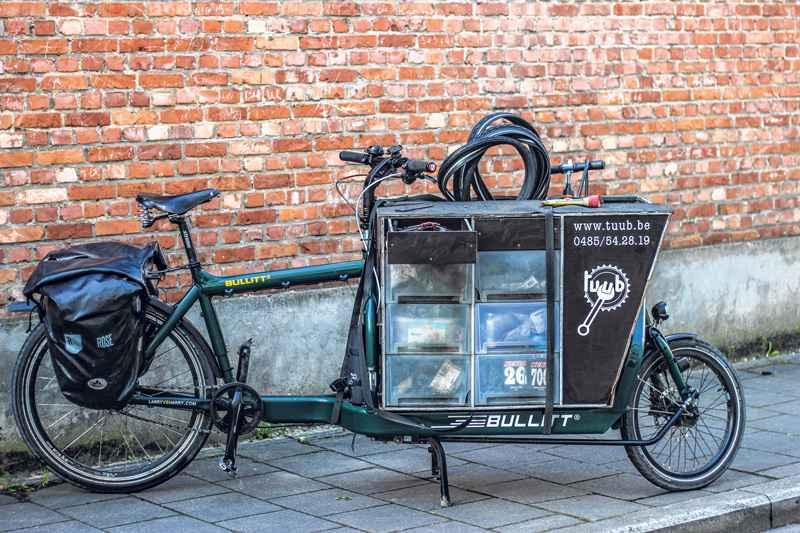 fietst bijna vier jaar rond als Tuub, de fietsende fietsenmaker in het Gentse. Vorig jaar gaf hij zijn job als leraar op. Sindsdien combineert hij zijn eigen fietsenwinkel, met een halftijdse mobiele hersteldienst. Wat heeft hij altijd bij voor zijn fietsherstellingen aan huis?