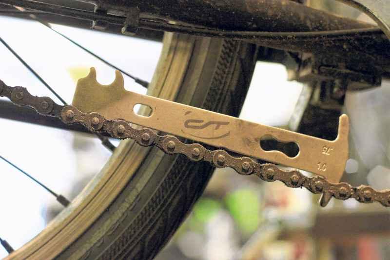 De kettingslijtagemeter haal ik altijd boven bij klanten. Hiermee meet ik hoe hard hun ketting versleten is. De ketting vervangen, aanpassen of smeren en de fiets rijdt weer soepel.