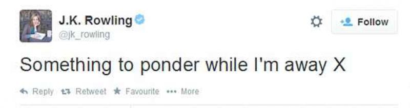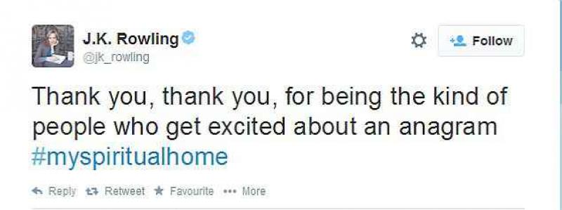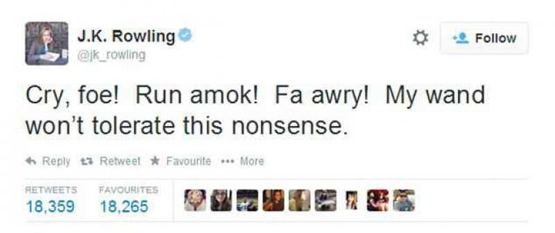 Sindsdien heeft Rowling geweigerd om een comeback uit te sluiten, maar er waren ook geen signalen dat er een nieuw Potter boek zou komen. Vandaar dat de fans van de reeks opgewonden waren door de tweet van Rowling: Cry, foe! Run amok! Fa awry! My wand won't tolerate this nonsense.'