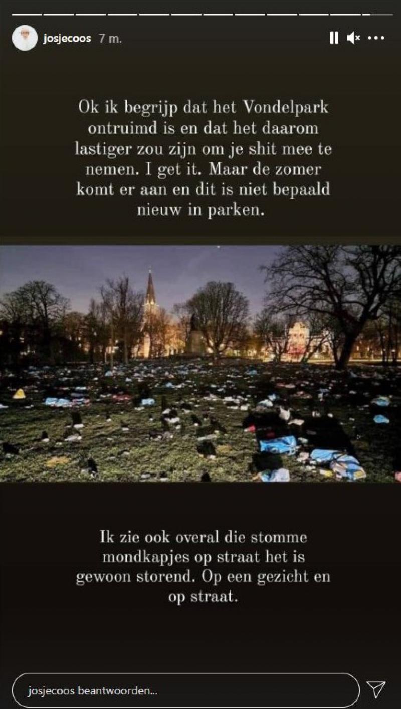 De voormalige K3-zangeres Josje Huisman (35) uitte op Instagram haar ongenoegen over het afval dat in het Vondelpark achtergelaten werd, maar zag geen graten in het feest zelf. Mannekes, even serieus: ga zo veel feesten als je wilt! Wees vrij en wees blij! Maar ruim wel je troep achter je op, hè. En als de prullenbakken vol zijn, neem je het mee naar huis en gooi je het in je eigen prullenbak, schrijft ze.