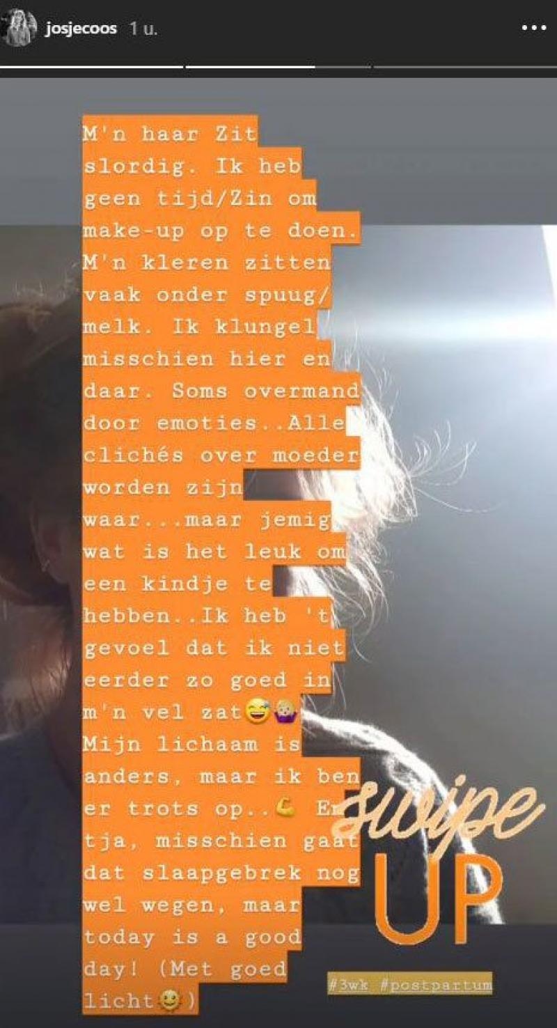Maar daarnaast benadrukt de 32-jarige Nederlandse dat ze nooit eerder zo gelukkig was als nu. Maar jemig, wat is het leuk om een kindje te hebben... Ik heb 't gevoel dat ik niet eerder zo goed in mijn vel zat. Mijn lichaam is anders, maar ik ben er trots op... En tja, misschien gaat dat slaapgebrek nog wel wegen, maar today is a good day!, klinkt het.