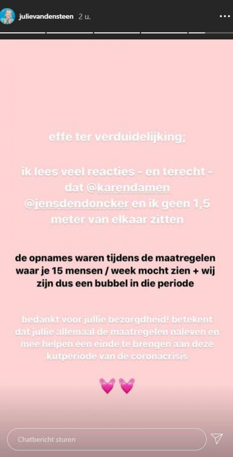 De 28-jarige presentatrice maakt op Instagram duidelijk dat de opnames al dateren van een tijdje geleden toen er nog veel meer mocht. Even ter verduidelijking: ik lees veel reacties en terecht dat Karen Damen, Jens Dendoncker en ik geen anderhalve meter van elkaar zitten. De opnames waren tijdens de maatregelen waarbij je 15 mensen per week mocht zien. Wij vormden overigens een bubbel in die periode. Bedankt voor jullie bezorgdheid! Dat betekent dat jullie allemaal de maatregelen naleven en mee helpen om een einde te brengen aan deze moeilijke periode van de coronacrisis, klinkt het.