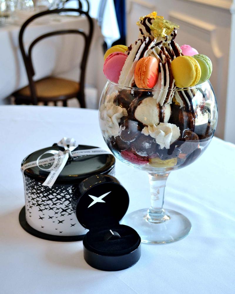 Het ijsje kost 1000 dollar (725 euro) en bevat vanille-ijs, chocolade truffels, Franse macarons en chocolade wodka saus, samen met een sorbet van Dom Perignon Rose en met bladgoud vergulde brownies. De prijs is inclusief een ring van Mauboussin gemaakt van goud en staal ter waarde van 530 dollar. De ijscoupe zelf zou rond de 470 dollar kosten.