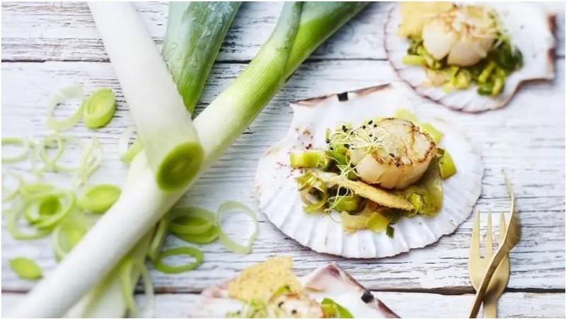 4. Spoel de noten van de Sint-Jakobsschelpen, voeg peper en zout toe en leg ze op absorberende keukenrol. Hou de schelpen bij voor de presentatie. Roer de crème door de prei en hou het mengsel warm.