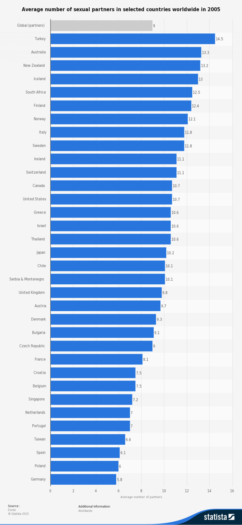 Na de Turken is er een nek-aan-nekrace tussen Australië (13,3) en Nieuw-Zeeland (13,2). Dat blijkt uit cijfers van condoomfabrikant Durex, die Statista in onderstaande infografiek goot. Ook in koude landen als Ijsland (13), Finland (12,4) en Noorwegen (12,1) kruipen de mensen een pak dichter bij elkaar dan gemiddeld.