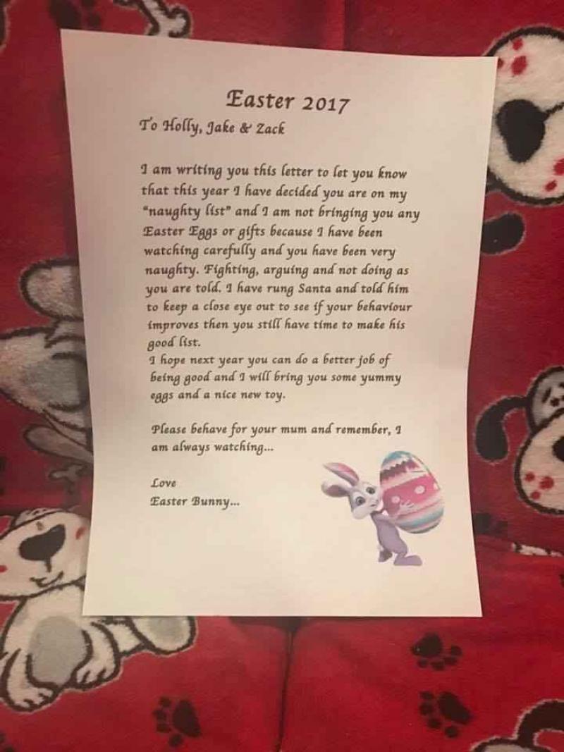De twee broertjes en het zusje volgden de sporen van de paashaas in hun huis tot ze op een brief stoten. De kindjes konden het volgende lezen: "Beste Holly, Jake en Zach, ik schrijf jullie deze brief om jullie te laten weten dat ik besloten heb jullie dit jaar op mijn 'stoute kinderenlijst' te zetten. Ik zaljullie geen paaseieren of cadeautjes geven omdat ik jullie goed in het oog heb gehouden en heb gezien dat jullie erg ondeugend zijn geweest. Jullie vechten, maken ruzie en doen niet wat jullie gevraagd wordt."