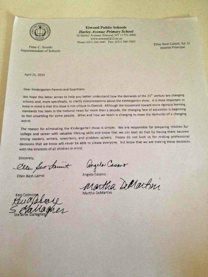 Vorige week vrijdag kregen de ouders van kleuters die naar de Harley Avenue Primary School gaan vreemd nieuws. De school last hun jaarlijks schoolfeest met een toneel door de kinderen af. De reden daarachter is volgens de interim-directrice dat de kinderen zich dan beter kunnen toeleggen op hun studies. De school hoopt zo dat de kinderen klaar zullen zijn voor een academische en professionele carrière. Hieronder vind je de brief, waarin de directrice en vier leerkrachten zeggen dat de kinderen moeten studeren in plaats van een toneel op te voeren.