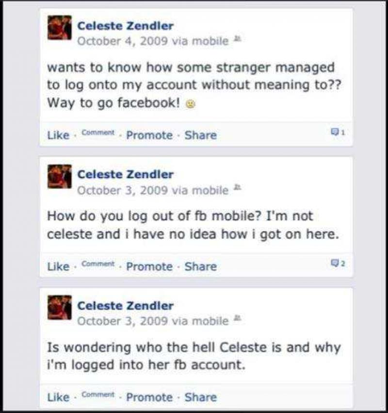 In 2009 probeerde Schuler Benson Facebook te openen op zijn klaptelefoon. In plaats van zijn eigen account, bevond hij zich plots op dat van Celeste Zendler. Schuler had echter geen flauw benul wie Celeste was of hoe hij zich kon uitloggen van haar profiel.