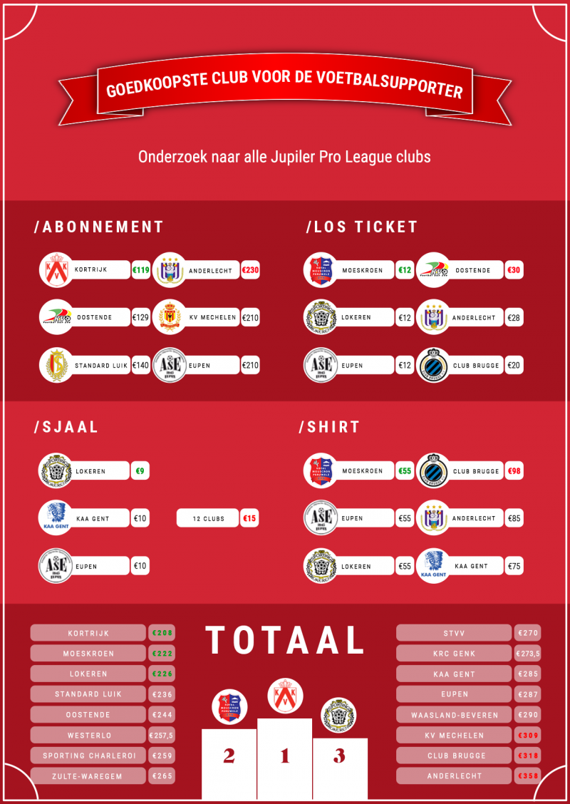 Het goedkoopste abonnement is te vinden bij Kortrijk (slechts 119 euro), terwijl je bij Anderlecht minimaal 100 euro meer betaalt om alle thuiswedstrijden te zien. De meest betaalbare losse tickets, 12 euro, zijn te koop bij Moeskroen, Lokeren en Eupen. Oostende komt hier als duurste uit de test (30 euro), omdat de goedkopere vakken daar al uitverkocht zijn aan abonnementhouders. Supporters van, opnieuw, Moeskroen, Lokeren en Eupen kunnen het wedstrijdshirt voor 55 euro het voordeligst aanschaffen. Fans van Club Brugge komen bedrogen uit met een prijs van maar liefst 40 euro(!) meer, wat neer komt op 95 euro voor een shirtje.