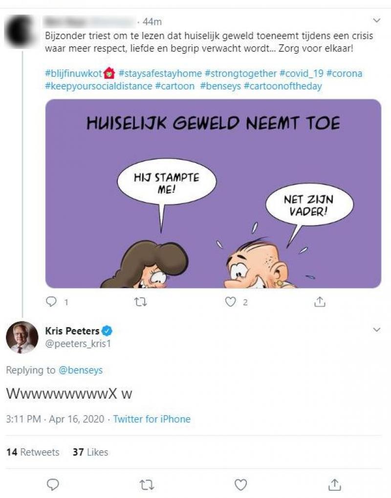 Een twitteraar deelde donderdagnamiddag een cartoon over huiselijk geweld. Niemand minder dan Kris Peeters antwoordde daarop, al was niet meteen duidelijk wat hij precies bedoelde. WwwwwwwwwX w, stond er te lezen.