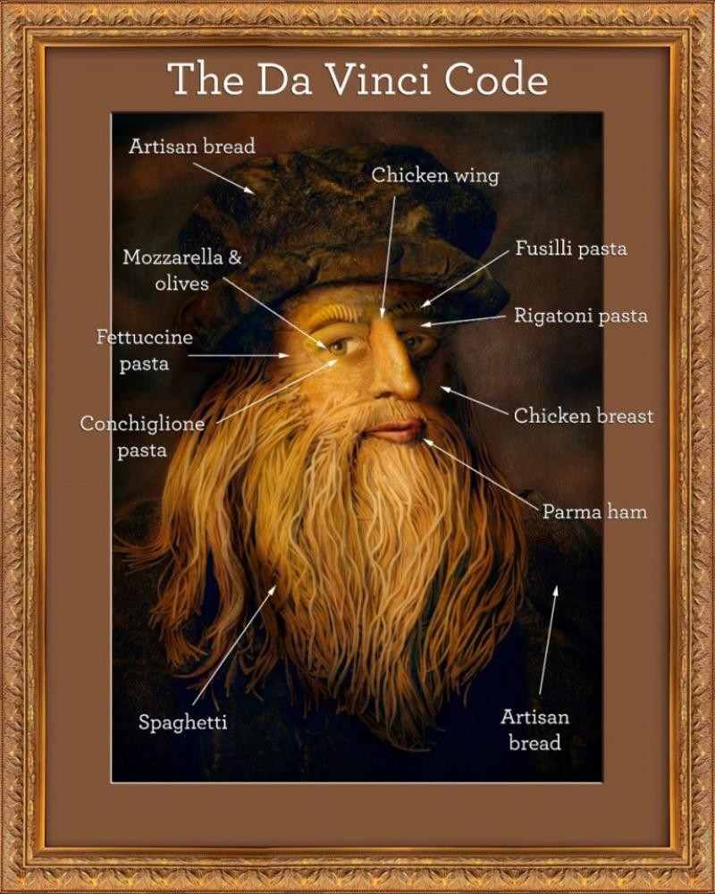 Aangezien da Vinci heel graag kookte - hij pende heel wat bedenkingen over eten en tafeletiquette neer - vond Bella Italia het dan ook gepast om zijn beeltenis te laten namaken met alleen maar ingrediënten uit hun menu. Warner en zijn team werkten 20 uur aan het werk. Ze kookten zeven verschillende soorten pasta, gebruikten kipfilets voor stukken van het aangezicht en olijven voor zijn ogen. Het resultaat lijkt verbluffend hard op het origineel.