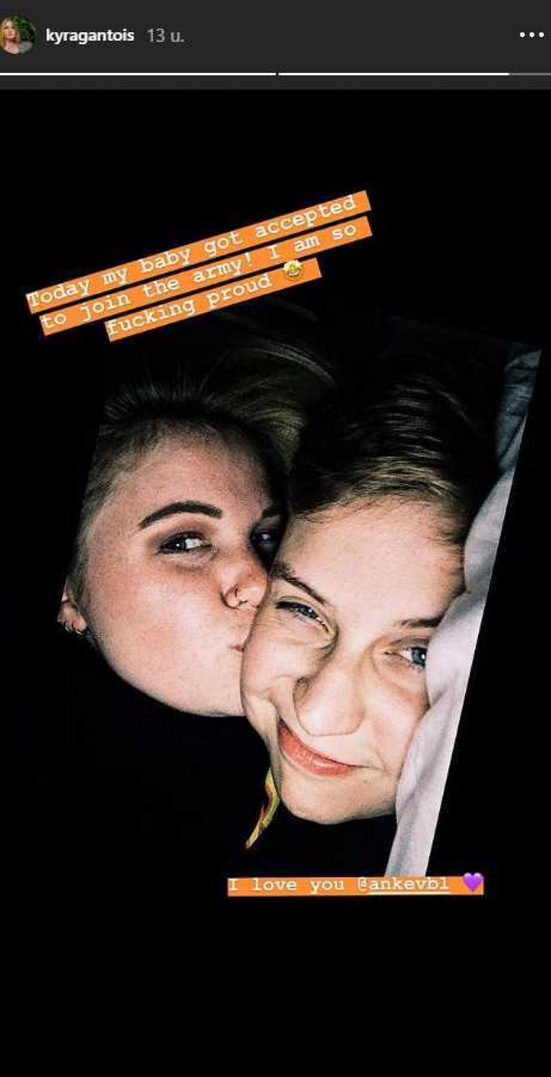 Intussen is Kyra al een tijdje samen met Anke, die net leuk nieuws heeft vernomen. Vandaag werd mijn schatje aangenomen bij het leger. Ik ben zo trots op haar! Ik hou van je, Anke, feliciteert Kyra haar.