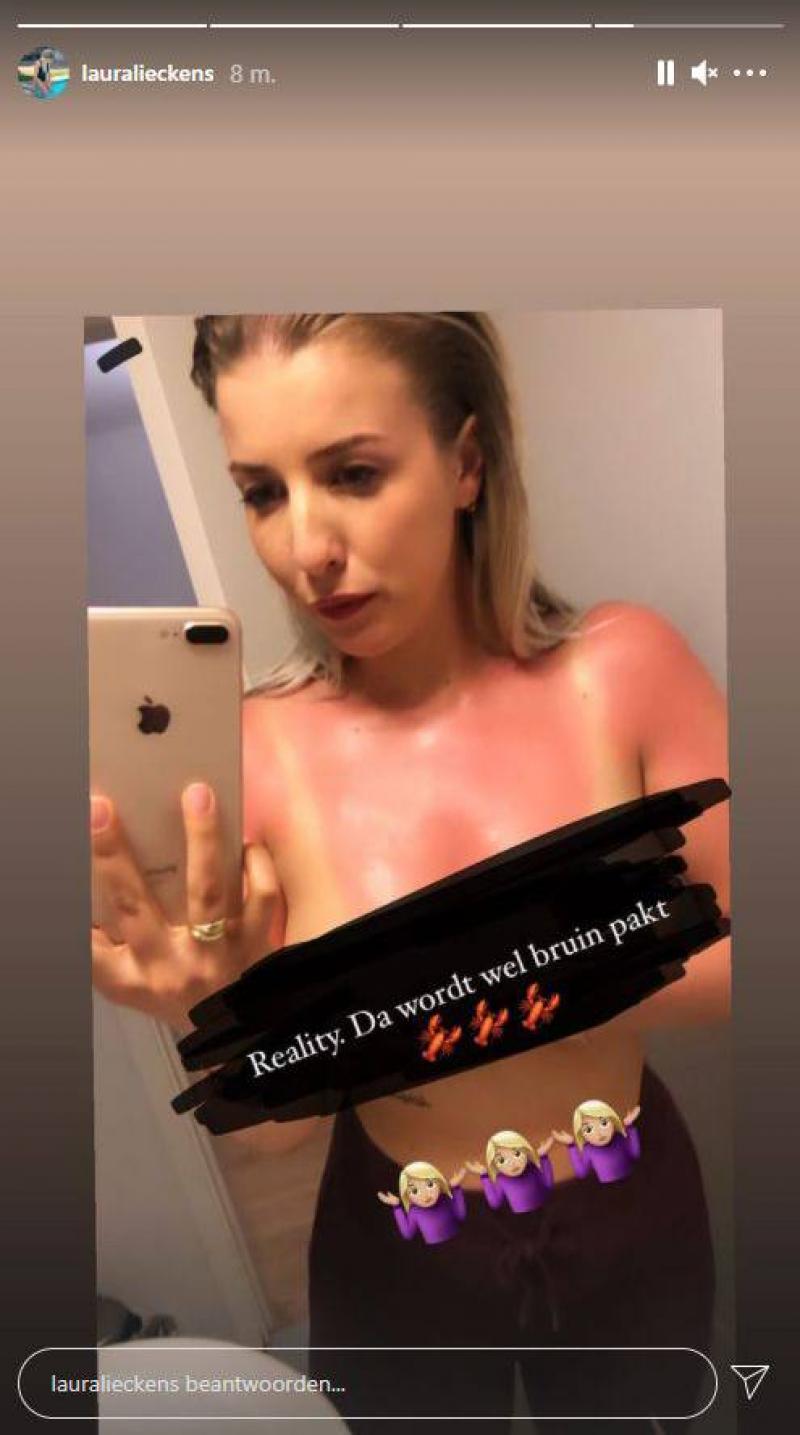 Vandaag werd ze zo rood als een kreeft wakker, dus wellicht onderschatte ze het brandende effect van de zon. Ze deelde een foto van haar verbrande bovenlichaam. Realiteit. Dat wordt wel bruin pakt , zucht ze.