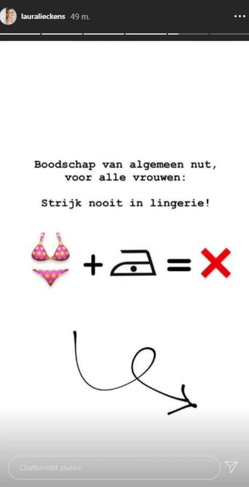 Ja, het is nog steeds heet. Nee, de hittegolf is nog niet voorbij. Ja, in huis zo weinig mogelijk kleren aandoen helpt tegen de warmte. Ook Laura Lieckens loopt thuis al een tijdje enkel in lingerie rond om de hitte te trotseren.